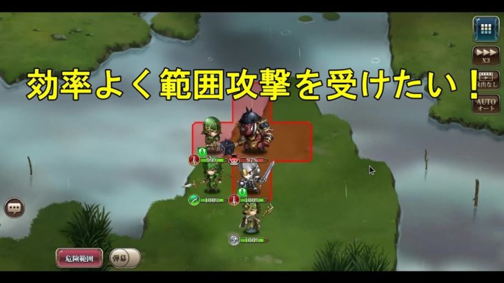 敵の範囲攻撃を効率よく喰らうためのステージのようです。2ターン目と5ターン目に使ってくる攻撃以外は受けた方がいいです。また、なぜか4ターン目以降敵のスキル範囲が狭くなるので5ターン目は魔法使いも攻撃できます。